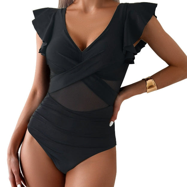 Dámské jednodílné plavky – Hluboký výstřih – Volánkové rukávy – Tylový detail