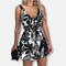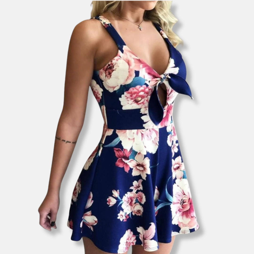Tento viskózový overal, ideální pro neformální příležitosti, má přiléhavý pas s rozšířenými kraťasy. Jeho střih bez rukávů je doplněn květinovým potiskem, výstřihem do V a detaily uzlů vpředu s výstřihem.
