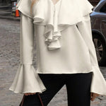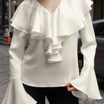 Béžová halenka s volánky, výstřihem do V a rozšířenými rukávy
