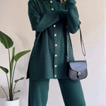 Dámská souprava – vesta na knoflíky a kalhoty s vysokým pasem – žebrovaný úplet – volný střih