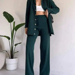 - Střih: Vesta s knoflíky a kalhoty s vysokým pasem a širokými nohavicemi